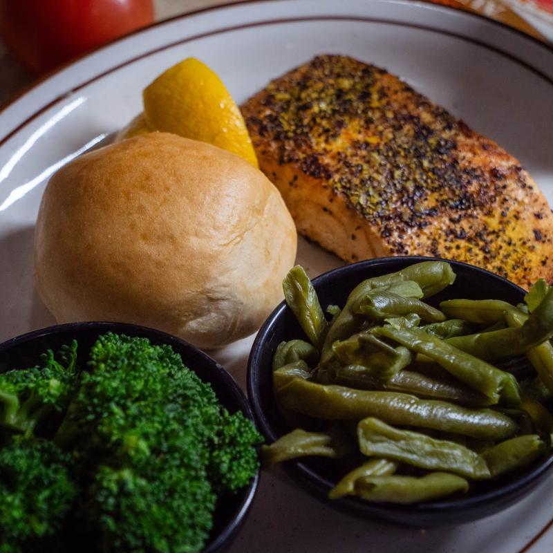 Served with your choice of soup or salad and two of the following items: mashed potatoes, French fries, rice, coleslaw, corn, broccoli, or carrots. Served with a dinner roll.
